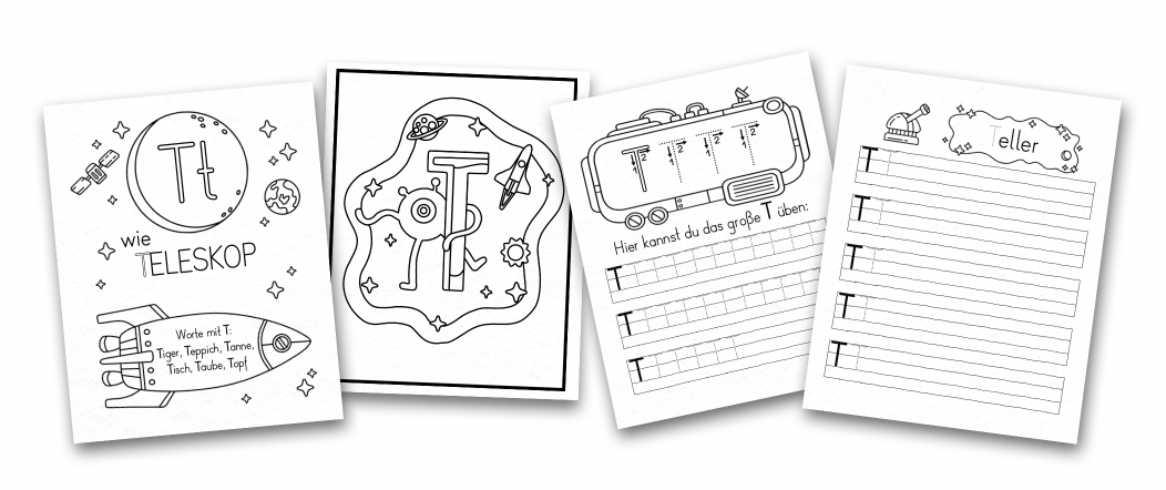 • Aa-Zz Übungsseiten zum Schreibenlernen, begleitet von den ABC-Weltraum Malbildern