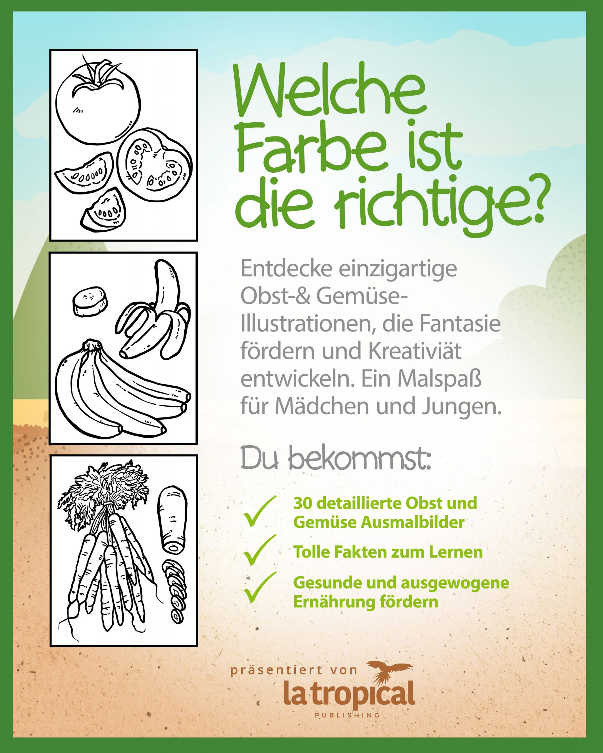 Kompromisslos für Kinder im Kindergarten, Vorschule und Grundschule! Überzeuge dich selbst mit dem: “Blick ins Buch” in der Produktansicht bei Amazon. Malen macht Spaß! Am Ende dieses Malbuches hast du Platz, um dein Lieblingsobst oder Lieblingsgemüse zu malen.🥑